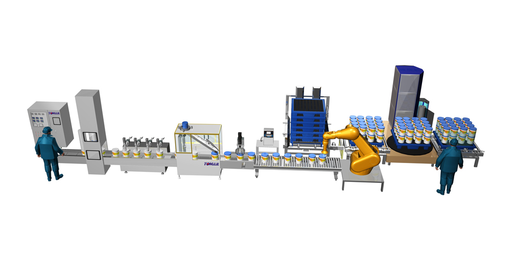 此條生產(chǎn)線(xiàn)設備配置:上桶機、全自動(dòng)稱(chēng)重式灌裝機、全自動(dòng)封蓋機、噴碼機、裝箱機、封箱機、機器人碼垛機/機械式碼垛機、自動(dòng)捆扎與纏繞機。